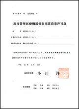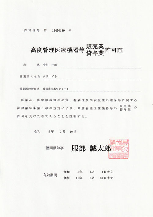 ●当店は、福岡県知事より薬事法に基づく「高度管理医療機器等販売賃貸業許可証」を有しています。